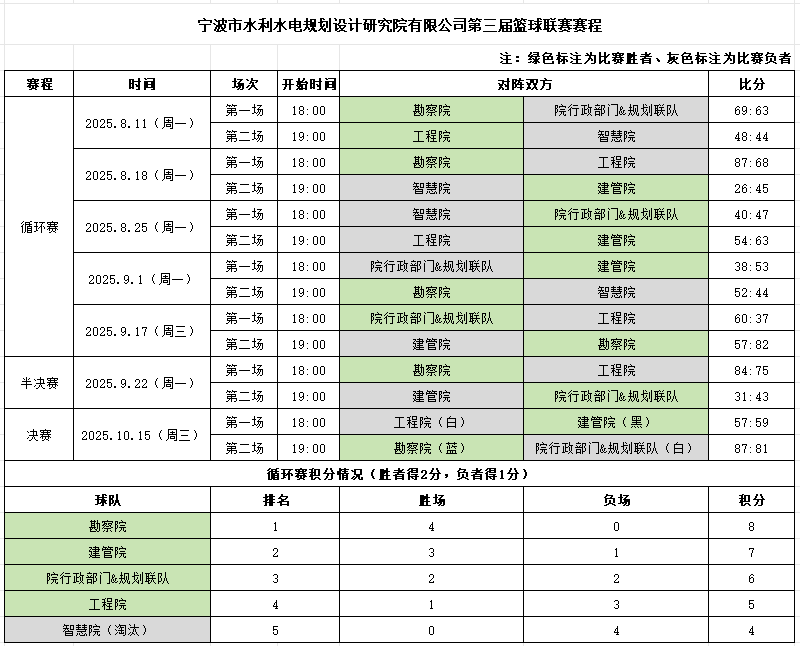建管院隊則以3勝1負積7分的戰(zhàn)績緊隨其后,其中8月25日與工程院隊的激戰(zhàn)中,以63:54險勝對手,展現了頑強意志。院行政部門&規(guī)劃聯隊和工程院隊分別以2勝2負和1勝3負的成績位列第三、四名,攜手晉級半決賽。