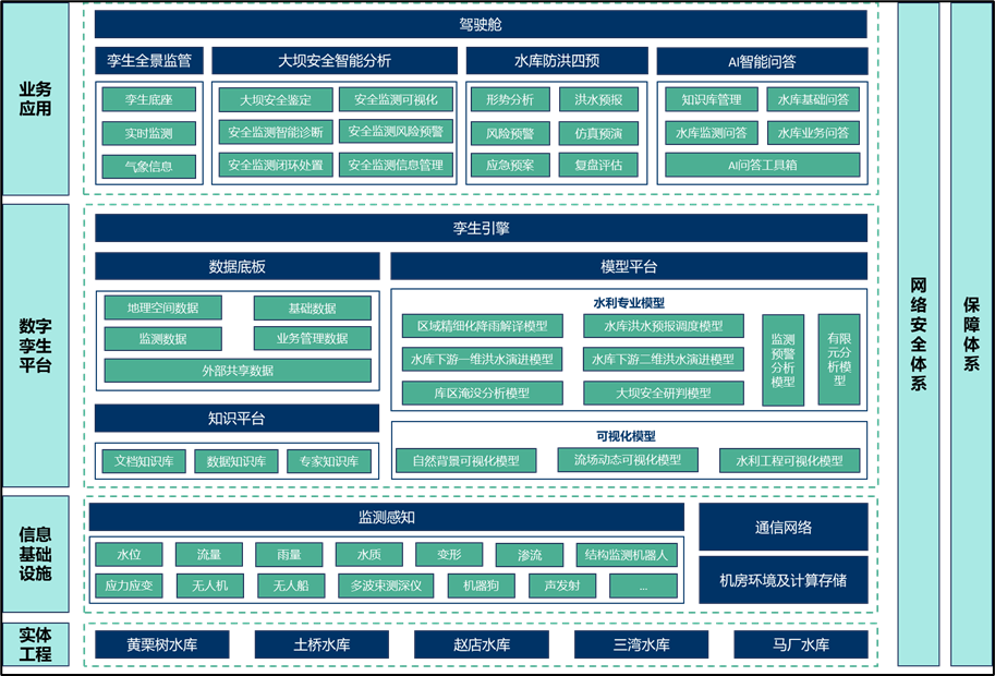《方案》以黃栗樹等五座水庫為核心對象,進行了前瞻性的信息化總體設計。旨在通過引入先進信息技術,構建覆蓋水庫運行管理全生命周期的智能化體系。該體系以實現(xiàn)對水雨情、工情、供用水、水質(zhì)及安全狀況等關鍵要素的精準感知、動態(tài)監(jiān)測、智能分析與高效決策為核心目標,全面提升水庫在科學調(diào)度、風險防控、管理效能與服務保障方面的綜合能力。主要建設內(nèi)容涵蓋智慧業(yè)務應用、數(shù)字孿生平臺、信息基礎設施及網(wǎng)絡安全體系,共同構成層次清晰、協(xié)同聯(lián)動、安全可靠的現(xiàn)代化水利信息化總體框架,為區(qū)域水安全與可持續(xù)發(fā)展奠定堅實的數(shù)字基石。