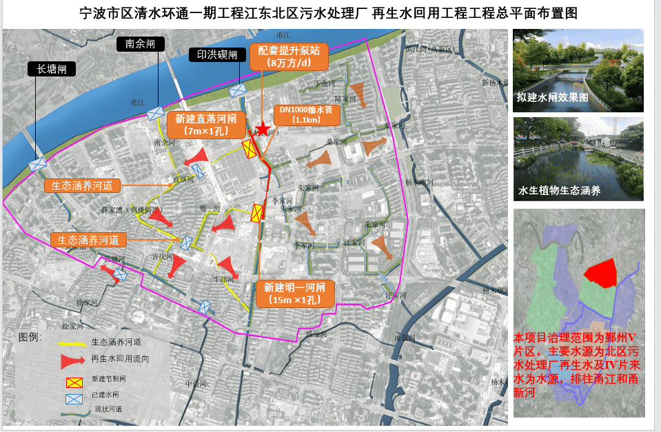 寧波市區(qū)清水環(huán)通一期工程江東北區(qū)污水處理廠再生水回用工程為增加河網(wǎng)水環(huán)境用水量,提升河網(wǎng)水體透明度及水體質(zhì)量,配套新建廠內(nèi)泵站1座,新建河道攔河鋼壩2座,新建再生水回用管道約1.1km,管道直徑約DN1000。水泵加壓后,通過引水管道將廠內(nèi)的水引至廠區(qū)外,與廠外的的輸水管道相接,管道沿后西河布置,并在直落河與明一河中設(shè)置兩個(gè)排口,出口各設(shè)置一座閥門井及一座攔河鋼壩。同時(shí)在直落河排口下游、明一河排口下游新建生態(tài)水源涵養(yǎng)區(qū)4.9km,配套岸線修復(fù)若干。