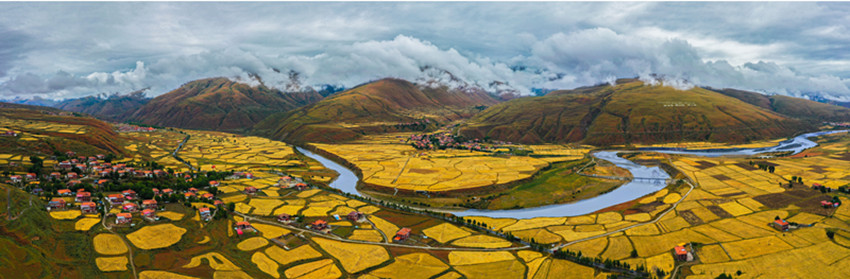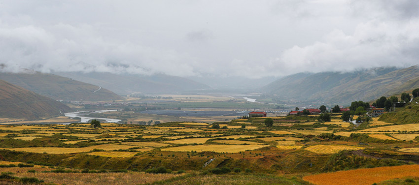 從立秋開(kāi)始,陽(yáng)氣漸收,萬(wàn)物內(nèi)斂。在希望的田野上,主色調(diào)也從象征繁茂、成長(zhǎng)的翠綠向代表成熟收獲的金黃漸變。爐霍縣蝦拉沱鎮(zhèn),藏房零星地點(diǎn)綴在田野間,成熟的農(nóng)作物漸染了整個(gè)秋季,讓這個(gè)小村莊如同一幅色彩斑斕的油畫。