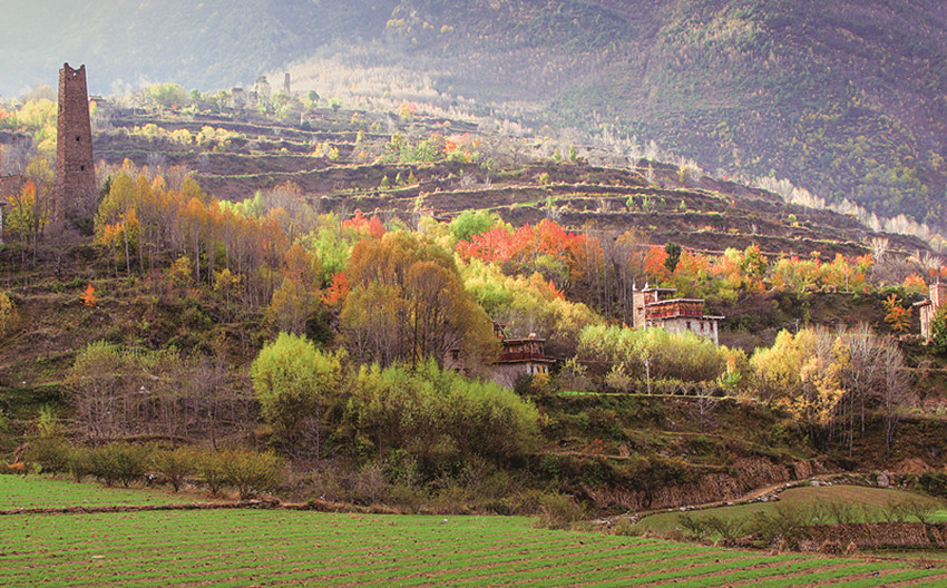 四季更迭,中路藏寨的魅力各異。秋天,正是藏寨最為絢爛的季節(jié)。造型獨(dú)特、別致的藏式民居,蜿蜒曲折的林間小道,組成了一幅美不勝收的畫卷。藏寨依山勢(shì)迤邐連綿,分布在相對(duì)高差近千米的山坡上,藏式樓房灑落在五彩斑斕的彩林中,與山谷、溪流、雪峰交相輝映,極富層次,構(gòu)成了一幅恬靜如詩(shī)的優(yōu)美畫卷。