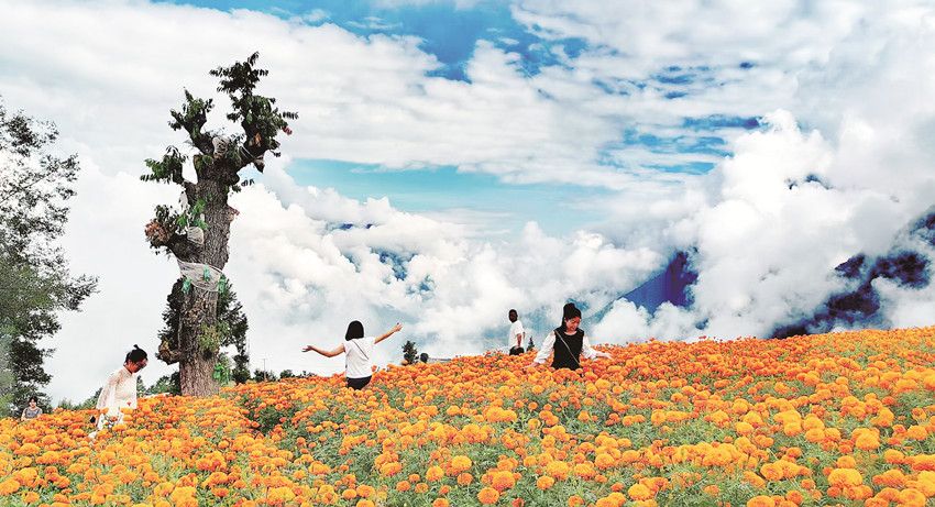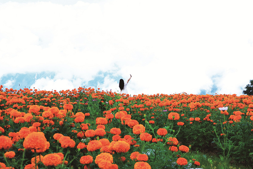 在這金風送爽的秋日,瀘定德威加郡海子村18萬株萬壽菊競相綻放,漫步在花海之中,人們可以感受秋風的輕撫,呼吸清新的空氣,寧靜的村寨依托著貢嘎雪山、藍天白云,在成片的萬壽菊裝點下構成了一幅亮麗的鄉(xiāng)村畫卷。