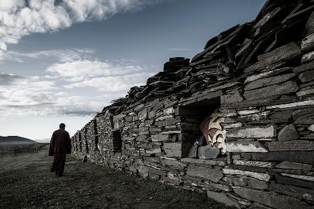 走近了,你會(huì)看見砌墻的石片上刻著密密麻麻的經(jīng)文;綿延的墻體上嵌著一個(gè)個(gè)窗口式的佛龕;每隔一段距離,石墻圍出一個(gè)回環(huán)的空間,類似于城墻上的烽火臺(tái);長(zhǎng)墻的兩端立著高大的佛塔,中段的108座佛塔排成長(zhǎng)長(zhǎng)的隊(duì)伍,和長(zhǎng)墻并行。