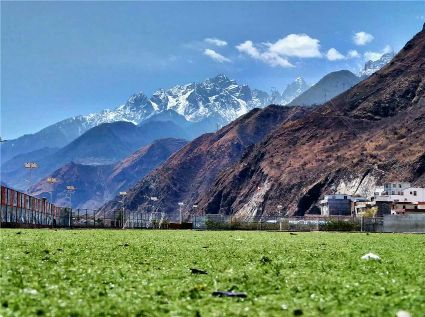 天空像剛被浸染的綢緞,蔚藍的主色已經略顯;白雪好似從浸染的綢緞上滴落下的顏料與其它顏色的混合,眷戀的駐足在山尖,在其耳旁傾訴來年的約定;一顆顆萬年青穩(wěn)穩(wěn)的站立,將山中的寺廟、亭閣緊緊地包圍,見證著康定四季輪回的變化;依然披著秋冬贈予黃色外衣的樹木,拋開桎梏,堅守在一座座樓房旁。藍與白,黃與綠……這大美的晴天為人們帶來了別樣的視覺盛宴。