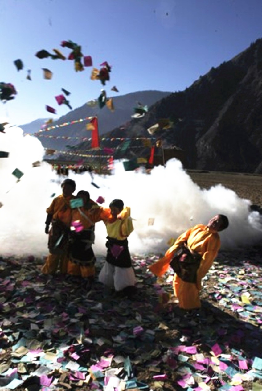 正午時(shí)分,村里的小伙子身著節(jié)日盛裝,手持木刀、木劍,肩扛松星到神山去祭山神,將木刀、木劍和松星插在神塔上,他們認(rèn)為這樣做就可以全副武裝山神了,任何妖魔鬼怪都不敢來侵?jǐn)_村莊了。小伙子們?cè)谏袼赃咟c(diǎn)燃柏枝,撒上青稞酒、糌粑、酥油、茶葉、大米等,然后圍著白塔轉(zhuǎn)經(jīng),呼喚著各種動(dòng)物的名字,喇嘛在一旁齊聲祈福。新龍人特別注重過十三節(jié),所有讓人興奮的娛樂活動(dòng)都會(huì)在十三這天下午在村子里隆重上演,村民不僅是各種娛樂活動(dòng)的參與者,更是最忠實(shí)的觀看者。