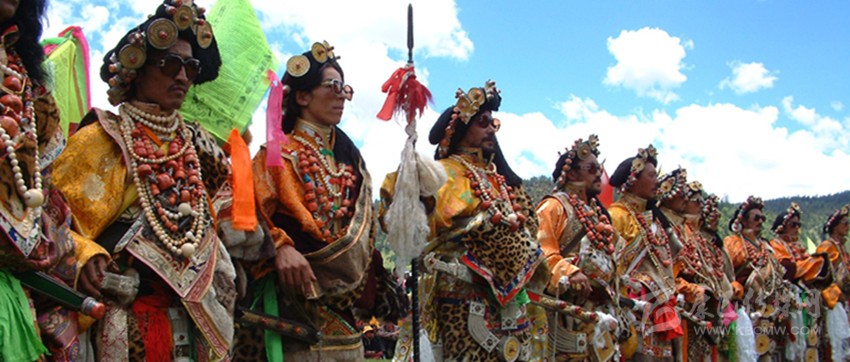 同時,因為康巴藏區(qū)雪峰林立,氣候寒冷。以號稱地球第三極地聞名遐邇。康巴人民世世代代就在這世界屋脊上過著“逐水草而居”的游牧和半牧半農(nóng)的生活。因而在服飾上也形成了具有典型的雪域高原民族獨有的地方風格特色??傮w呈現(xiàn)出寬大粗獷、英武健美、豪氣颯爽的特點和大襟、寬腰、長袖、超長、無扣的特征。而色彩是康巴藏族服飾點綴美的靈魂,他們在色彩運用上十分著重色塊與整體的相襯與和諧,其運用最多的紅、黃、藍、綠、白、黑,往往包含了宗教的象征意蘊,又歸納了雪域大自然所呈現(xiàn)的直觀表征:他們認為藍、白、綠、紅、黃五彩是菩薩的服裝,藍色代表藍天,白色表示白云,綠色表示河流,紅色表示空間護法神,黃色表示大地。這是康巴人貼近自然的感恩之情和神性世界的精神延續(xù)的又一直接表達。