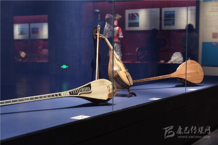 走進(jìn)凹字型的展廳內(nèi),可見蒙古族的馬頭琴、哈薩克族的冬不拉、維吾爾族的手鼓朵帕、回族的掛毯湯壺等。展覽以實(shí)物和圖片相結(jié)合的形式,從“草原驕子”、“刀郎木卡姆”、“駿馬與詩(shī)歌”、“花兒與少年”四部分展現(xiàn)博爾塔拉草原上各民族獨(dú)具魅力的生產(chǎn)方式、衣食住行、傳統(tǒng)技藝、民族服飾、文化娛樂等民俗風(fēng)情,為觀眾呈現(xiàn)了博州異彩紛呈的地域文化。