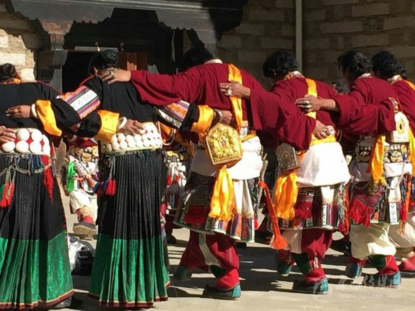 稻城蒙自鍋莊古樸典雅,表演時分男女兩隊(duì)輪唱輪舞。舞蹈時相互牽手或扶腰,低首俯身,舞姿低矮,上身動作較小,主要動作集中在腿部的踏地和靠腿。