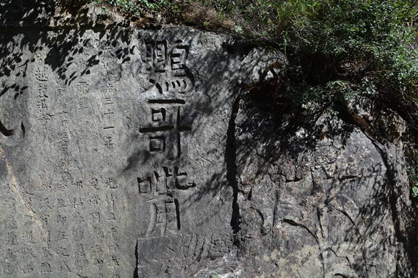 《竺國通衢》刻在一顆大石頭的下部,石高約三米,長約六米,刻于清道光年間,意為通向印度的通道,充分說明這條道路的價(jià)值和作用。大石和字已藏在核桃樹下,勢大必難除,加之雨水侵蝕下已風(fēng)化嚴(yán)重。