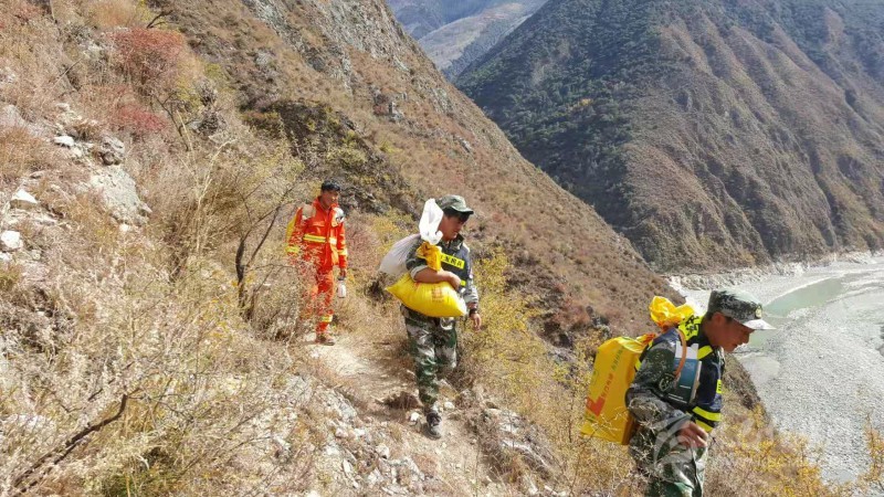 車輛無法前行,白玉縣民兵以及相關應急隊伍將救災物資順著小路背上現場