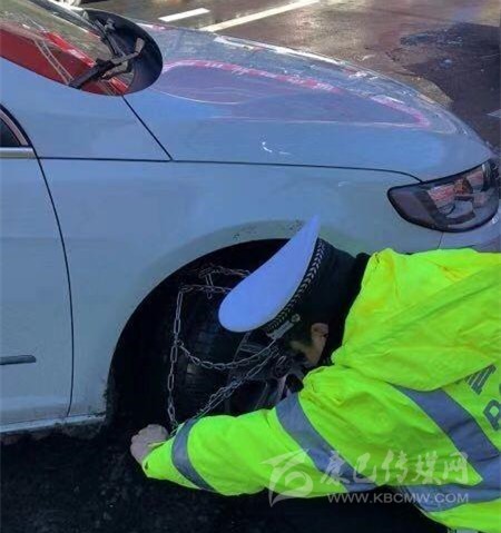 圖為民警幫助掛防滑鏈