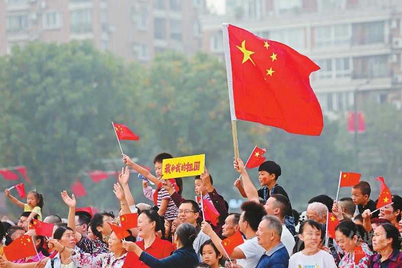 上午10時,慶祝中華人民共和國成立70周年大會開始。通過電視信號,大會盛況傳遞至每個現(xiàn)場?!芭c祖國母親同在,祝福祖國繁榮昌盛?!边@是大家共同的心聲。□本報記者 林凌 何勤華 程文雯 徐中成 陳碧紅 文莎