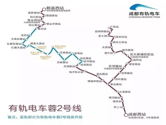 有軌電車(chē)蓉2號(hào)線工程線路呈Y型布局,線路經(jīng)過(guò)青羊區(qū)、金牛區(qū)、高新西區(qū)、郫都區(qū),線路全長(zhǎng)39.3km。其中首開(kāi)段起于合信路站,止于晨光站共計(jì)13.7km,已于2018年12月26日開(kāi)通,非首開(kāi)段長(zhǎng)度共計(jì)25.6km。
