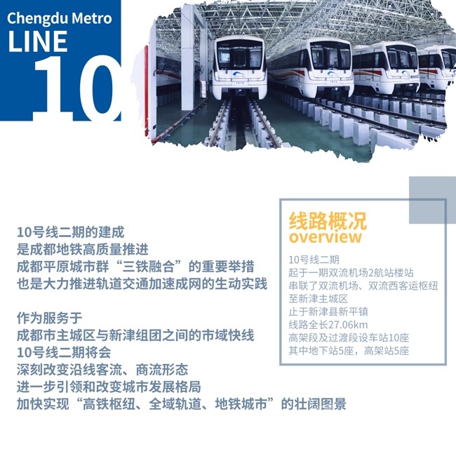 10號(hào)線二期起于一期雙流機(jī)場(chǎng)2航站樓站,串聯(lián)了雙流機(jī)場(chǎng)、雙流西客運(yùn)樞紐至新津主城區(qū),止于新津縣新平鎮(zhèn),線路全長(zhǎng)27.06km,高架段及過(guò)渡段設(shè)車(chē)站10座,其中地下站5座,高架站5座。