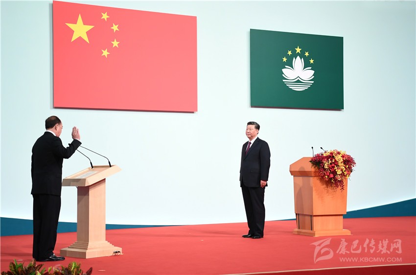 慶祝澳門回歸祖國20周年大會暨澳門特別行政區(qū)第五屆政府就職典禮20日上午在澳門東亞運動會體育館隆重舉行。中共中央總書記、國家主席、中央軍委主席習(xí)近平出席并發(fā)表重要講話。他指出,澳門回歸祖國20年來,澳門特別行政區(qū)政府和社會各界人士同心協(xié)力,開創(chuàng)了澳門歷史上最好的發(fā)展局面,譜寫了具有澳門特色的“一國兩制”成功實踐的華彩篇章。他希望澳門特別行政區(qū)新一屆政府和社會各界人士站高望遠(yuǎn)、居安思危,守正創(chuàng)新、務(wù)實有為,在已有成就的基礎(chǔ)上推動澳門特別行政區(qū)各項建設(shè)事業(yè)躍上新臺階。