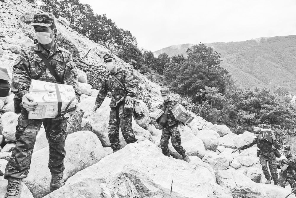 在地震發(fā)生后的48小時內(nèi),救援隊伍拼盡全力在水流湍急的河面搭設便橋,在不可能通行的地方,奮力開辟出一條生命通道,一箱箱應急救援物資靠肩扛人背送往共和村,部分急需轉移的鄉(xiāng)親被一支支救援隊伍及時送到安全地帶,妥善安置。
