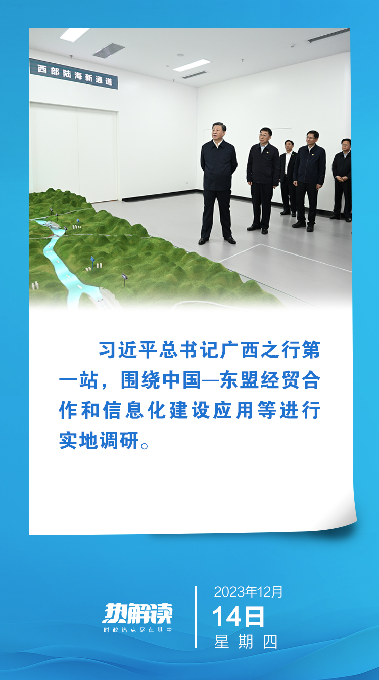 熱解讀12月14日,結(jié)束越南出訪回國后,習(xí)近平總書記在廣西考察。第一站,他走進中國—東盟信息港股份有限公司,圍繞中國—東盟經(jīng)貿(mào)合作和信息化建設(shè)應(yīng)用等進行實地調(diào)研。