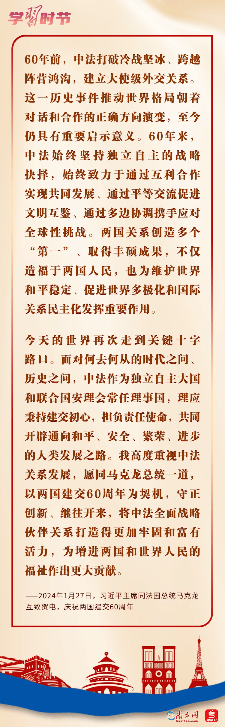 1月27日,國家主席習(xí)近平同法國總統(tǒng)馬克龍互致賀電,慶祝兩國建交60周年。習(xí)近平主席指出,60年前,中法打破冷戰(zhàn)堅冰、跨越陣營鴻溝,建立大使級外交關(guān)系。兩國關(guān)系創(chuàng)造多個“第一”、取得豐碩成果,不僅造福于兩國人民,也為維護世界和平穩(wěn)定、促進世界多極化和國際關(guān)系民主化發(fā)揮重要作用。