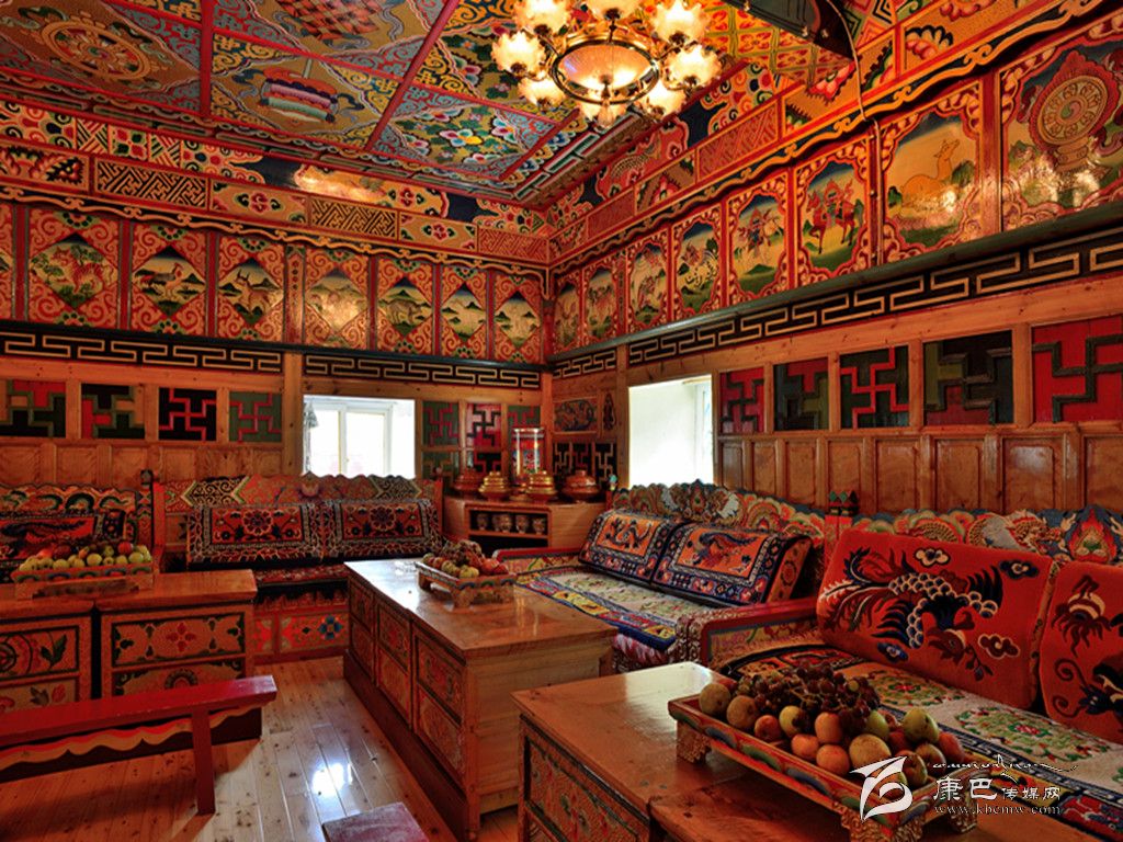 在功能布局上,打造別墅式風格,對公共區(qū)域和每個院落進行改造,擴大綠化面積,強化視覺效果;在外觀設計上,根據(jù)藏族傳統(tǒng)的建筑風格,提升風貌改造,從外觀上體現(xiàn)原滋原味的本土特色;在色調(diào)搭配上,采用藏族偏愛的暖色調(diào)和古典色加以渲染,融合現(xiàn)代與民族特色;在室內(nèi)裝修上,使用精美的藏式地毯、銅器、陶制品等傳統(tǒng)藏式器皿裝飾,采用唐卡、藏族題材油畫等元素點綴,并適當差異化裝修,以體現(xiàn)自然隨性舒適,讓游客透過每一個家庭感受到濃郁的藏寨風情。
