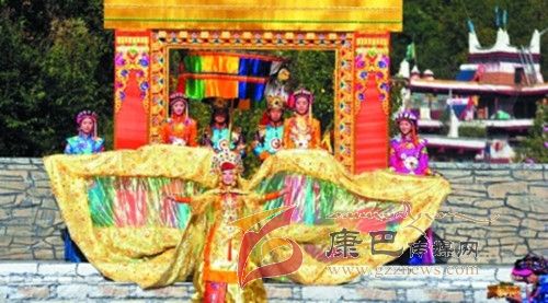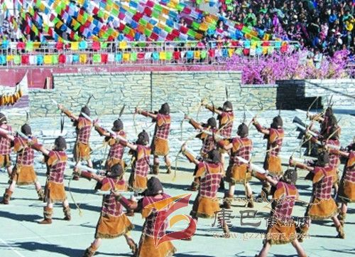 在催人奮進(jìn)的戰(zhàn)鼓聲中,一群身披甲胄的士兵拿著長(zhǎng)劍,背著巨弓走到臺(tái)前,在鏗鏘的戰(zhàn)鼓聲中,戰(zhàn)士們做著各種競(jìng)技動(dòng)作,模仿武士們互相攻擊的樣子,那矯健的身影展示了遠(yuǎn)古時(shí)代嘉絨藏族先民們?yōu)榱松媾c自然努力抗?fàn)幍膱?chǎng)景。過(guò)了一會(huì)兒音樂(lè)一轉(zhuǎn),戰(zhàn)鼓聲漸漸減弱,在鳥(niǎo)雀的陣陣啾啾聲中,一座木門(mén)慢慢的開(kāi)啟,一位身披長(zhǎng)袍、頭戴鳳冠的女王在眾多美女的簇?fù)硐?,緩緩走下臺(tái)階步入舞臺(tái)中央,此時(shí),一位手捧托盤(pán)的老者來(lái)到女王面前單膝下跪,將托盤(pán)高舉過(guò)頂,并邀請(qǐng)女王品嘗佳肴,女王將中指在酒中蘸了蘸,并曲起中指向四周輕輕彈去,寓意愿將杯中美酒與四方百姓同飲。在女王面前還放置著一個(gè)凈水桶,桶中盛滿了清澈的甘泉,桶上橫放著一枝柏樹(shù)枝,女王伸出纖纖玉手,拿著柏樹(shù)枝在水中蘸了蘸,面向墨爾多神山撒去,寓意向神山祈福。這是此次《美人谷·丹巴》節(jié)目展演中的序曲部分,有著強(qiáng)烈的東女神韻,將遠(yuǎn)古時(shí)代東女國(guó)女王遺風(fēng)展演的淋漓盡致。