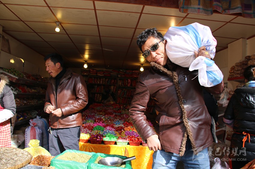 走進郭達橋重康糖果店,洛讓說:“多買點糖果糕點,娃娃老婆喜歡?!比缓笳諉吸c貨:花生10斤、瓜子5斤、葡萄干5斤、水果糖5斤、軟糖5斤、炒米糖10斤……一下就指點了八九種糖果糕點??吹搅诉@樣的生意,老板樂開了花。與洛讓大包大攬的氣派不同,長期經(jīng)商的扎西老練地詢價:“老板,我們買這么多,要優(yōu)惠喲?!币环憙r還價之后,洛讓和扎西買了十種糖果,用去1066元,裝滿整整兩編織袋。洛讓把糖果過扛在肩上,對筆者說:“你來試一下,有點分量,你別說,辦年貨也是一種體力活喲?!?/p>