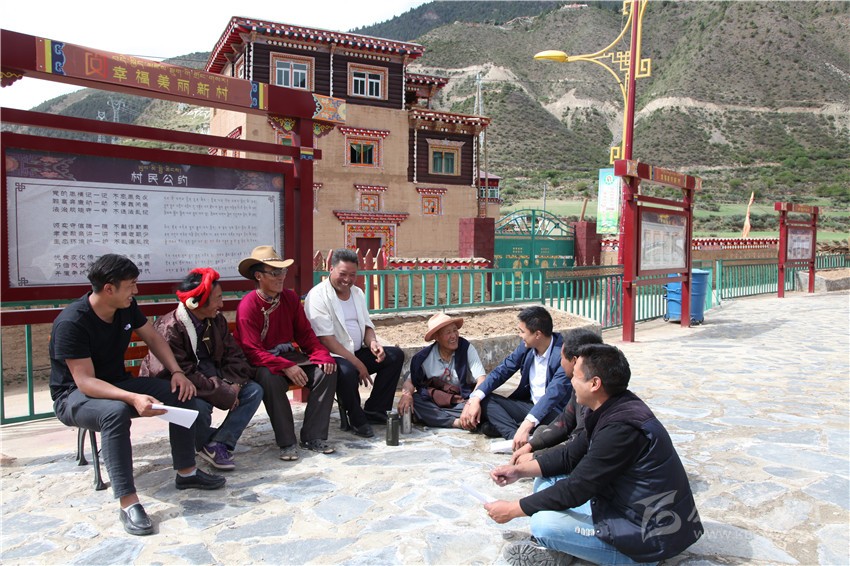 在540多平方米的片石文化院壩內(nèi),10個(gè)用片石砌成的花臺(tái)、10個(gè)1米高的綠色鐵質(zhì)雕花欄桿將整個(gè)院壩圍了起來(lái);在院壩的右前方,一根10來(lái)米高的鋁合金旗桿上,飄揚(yáng)著一面鮮艷的五星紅旗;而院壩的左側(cè)和正前方,整齊地?cái)[放著6個(gè)3米高、3米寬的鋼架結(jié)構(gòu)雙層玻璃宣傳櫥窗。櫥窗內(nèi),精心制作的宣傳內(nèi)容格外引人注目:從習(xí)近平新時(shí)代中國(guó)特色社會(huì)主義思想,到社會(huì)主義核心價(jià)值觀;從“愛(ài)黨愛(ài)國(guó)、誠(chéng)信包容、孝善為先、感恩奮進(jìn)”的村民精神,到“孝善立村、依法治村、生態(tài)美村、文旅興村、產(chǎn)業(yè)富村”的發(fā)展思路;從“保護(hù)環(huán)境用加法,越加越美、治理污染用減法,越減越少、致富奔康用乘法,越乘越快、革除陋習(xí)用除法,越除越新”的加減乘除,到“家庭和睦、鄰里融洽、喜事儉辦、婚事新辦”的文明新風(fēng);從“凡事守法、遇事找法、辦事依法”到“打架尋仇害處大、依法辦事好處多”的法治宣傳;……正當(dāng)記者看得津津有味時(shí),恩珠、覺(jué)來(lái)等三位六七十歲的村民老遠(yuǎn)就在招呼白瑪其麥。幾分鐘之后,他們徑直走進(jìn)文化院壩,并習(xí)慣性地坐在長(zhǎng)條木椅上或地上邊曬太陽(yáng)邊聊天,那爽朗的笑聲、喜悅的表情,讓人為之動(dòng)容。