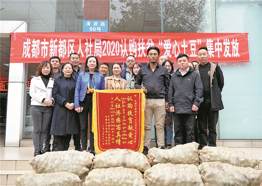 “感謝你們幫助認(rèn)購(gòu)3萬(wàn)余斤土豆……扎西德勒!”11月6日上午8點(diǎn)36分,“愛(ài)心土豆”車隊(duì)剛在新都區(qū)人社局停車場(chǎng)停穩(wěn),降央吉村一個(gè)躍步下車,為等候多時(shí)的人社局送上“認(rèn)購(gòu)扶貧獻(xiàn)愛(ài)心、人社濟(jì)困寫真情”的錦旗。