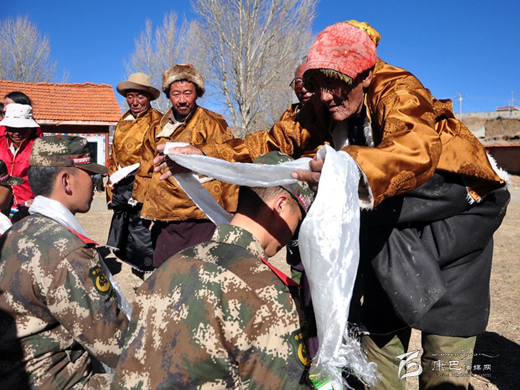 春節(jié)期間,理塘縣敬老院老人為前來(lái)慰問(wèn)的官兵獻(xiàn)哈達(dá)。