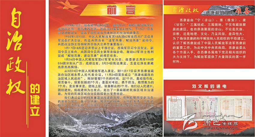 《甘孜州檔案館愛(ài)國(guó)主義教育基地》的整個(gè)展覽分為四大板塊。第一部分命名為“自治政權(quán)的建立”,向參觀者介紹了甘孜藏族自治州誕生的歷史過(guò)程;第二部分是“民主改革運(yùn)動(dòng)”,把人們帶回了那段不能忘記的烽火歲月;第三部分是“社會(huì)主義建設(shè)”,深情地回顧了在建設(shè)社會(huì)主義事業(yè)中我州所取得的不平凡的成就;第四部分是“改革開(kāi)放”,讓人們重溫了在改革開(kāi)放的大潮中所經(jīng)歷的那些充滿(mǎn)激情的經(jīng)歷。