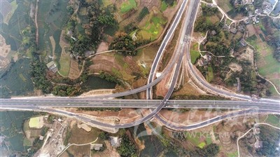 上午11時(shí)許,當(dāng)記者驅(qū)車(chē)到達(dá)對(duì)巖樞紐互通立交,用無(wú)人機(jī)從空中俯拍,這個(gè)縱橫交錯(cuò)、恢弘磅礴的交通樞紐,宛如盤(pán)旋在云端的銀龍,又似在大地上延伸的血脈,其造型、規(guī)模、結(jié)構(gòu)都令人嘆為觀止。