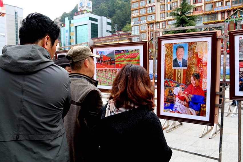 市民正在觀看“大美甘孜——慶祝中華人民共和國(guó)成立70周年攝影展“作品《趕上好時(shí)代》。