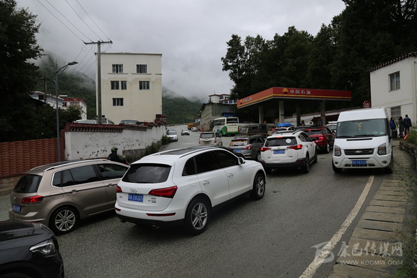 8月7日上午9時(shí)10分,中石油康定市折多山加油站,左側(cè)加油進(jìn)車口排起了長(zhǎng)龍,記者目測(cè),在加油站進(jìn)口處,等待加油的車輛已排成三排,約有六七十米遠(yuǎn),當(dāng)時(shí)等待加油的車輛有43輛。排隊(duì)車輛占據(jù)了國(guó)道318線此路段一半路面,從折多山方向駛來的車輛很多,有部分車輛沒料到此路段有車輛占道,急忙放緩車速。