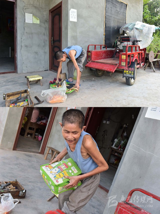 “周強善曾是全鄉(xiāng)最困難的貧困戶。”中心鄉(xiāng)黨委書記楊壘說,周強善的妻子在剛生下女兒后因病去世。2005年,他在外務工時右腿受傷,留下殘疾。后來他自學補鞋技術,成了一名鞋匠,但腿腳不便、下山路不通,三娃多年“悶”在家里。