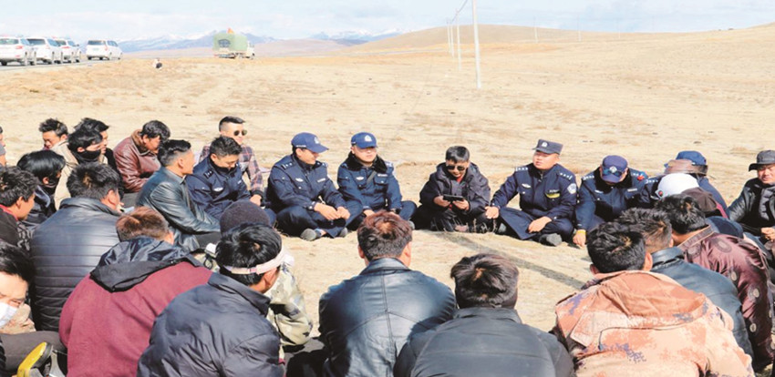 稍作休整,為了讓蟲(chóng)草采集群眾和隨行的數(shù)十臺(tái)各型車(chē)輛安全到達(dá)魯然蟲(chóng)草山,派出所民輔警和鄉(xiāng)鎮(zhèn)工作人員組織群眾席地而坐召開(kāi)壩壩會(huì),核查入山證,講明道路交通安全、森林草原防火知識(shí),提醒群眾遵紀(jì)守法、文明進(jìn)山。