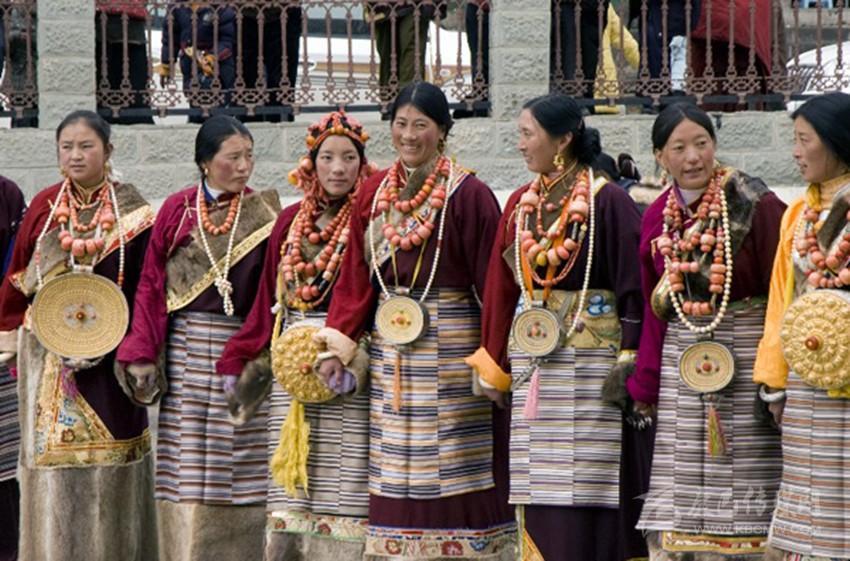 被稱為“瘋裝”的鄉(xiāng)城婦女服飾,最初形成于文成公主進(jìn)藏時期,于云南麗江納西族木氏土司統(tǒng)治時期定型,并吸納納西族婦女穿的齊膝圍裙的形狀特點(diǎn),它的特點(diǎn)是褶皺多,分內(nèi)折、外折各54個。左右胸襟分別鑲有紅、黃、綠、黑、金五塊三角形布料,它們分別代表福壽、土地、先知、牲畜、財富。瘋裝,寄托著把人間福氣都聚齊了的寓意。雙袖肘處鑲有一片彩色布料,占整個衣袖的三分之一,袖邊嵌一小塊寸許寬綠布。裙鑲約1厘米粗的紅色羊毛條;背部嵌1.5尺見方稱為“公熱”的墊背。