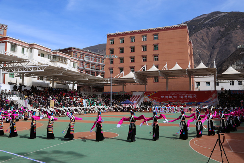 弦音聲動鬧新年,紅綾長袖舞春風(fēng),千人弦子鍋莊,唱出龍年大團(tuán)圓,踏出幸福新舞步……2月13日,在巴塘縣全民健身活動中心舉行的春節(jié)暨藏歷新年系列活動“文化·點(diǎn)靚生活”——巴塘縣五彩藏鄉(xiāng)藝術(shù)周弦子鍋莊展演活動現(xiàn)場喜氣洋洋、人頭攢動,上千名群眾身穿節(jié)日盛裝,拉起弦胡,載歌載舞,共同慶祝新春佳節(jié),祈盼龍年國泰民安、風(fēng)調(diào)雨順。圖為活動現(xiàn)場。 敖梅 李穎/文 格桑澤仁/圖